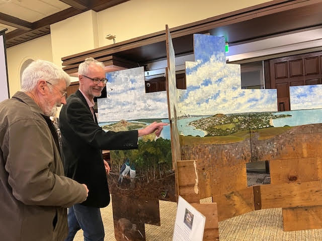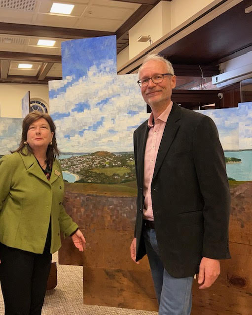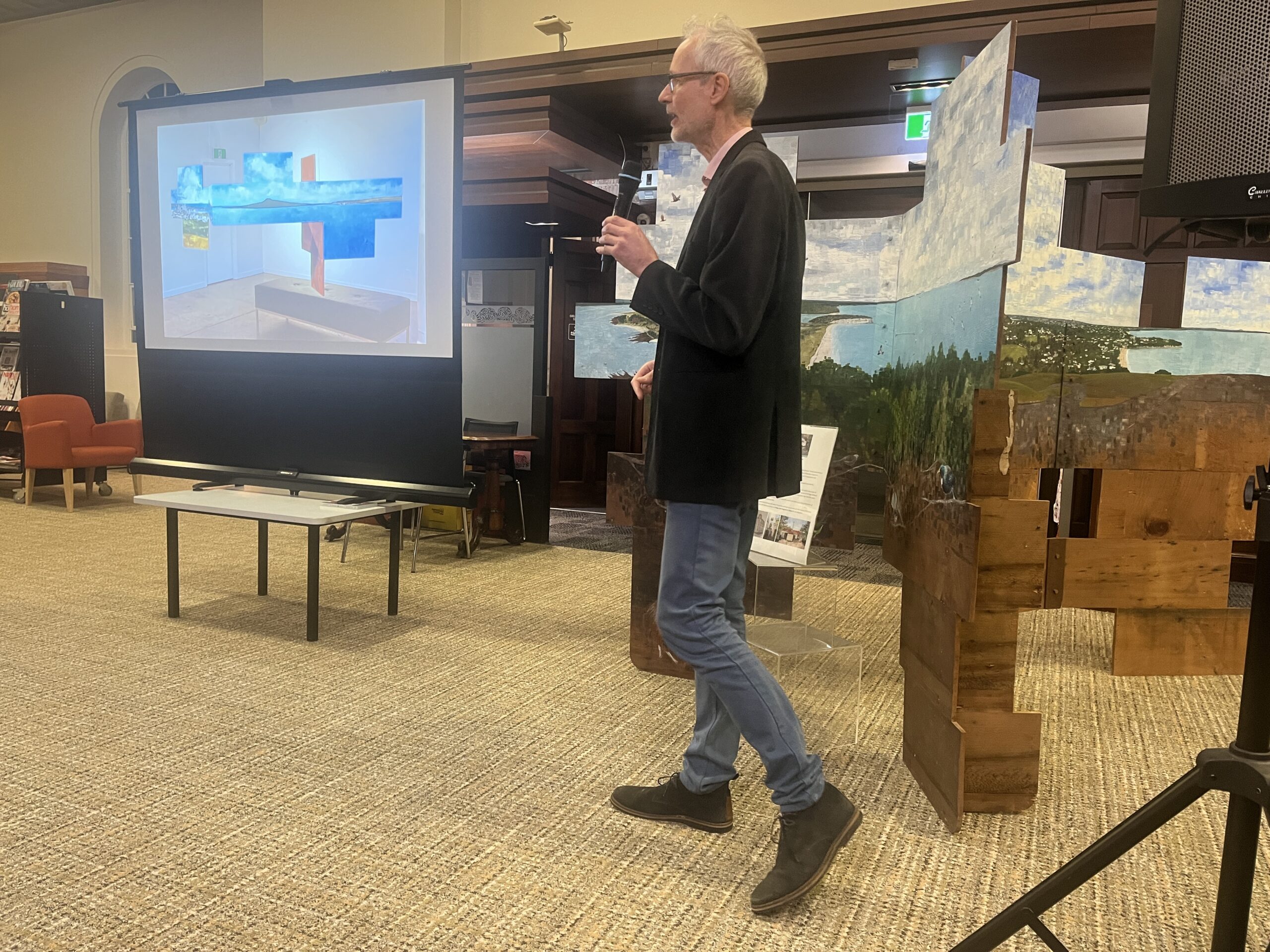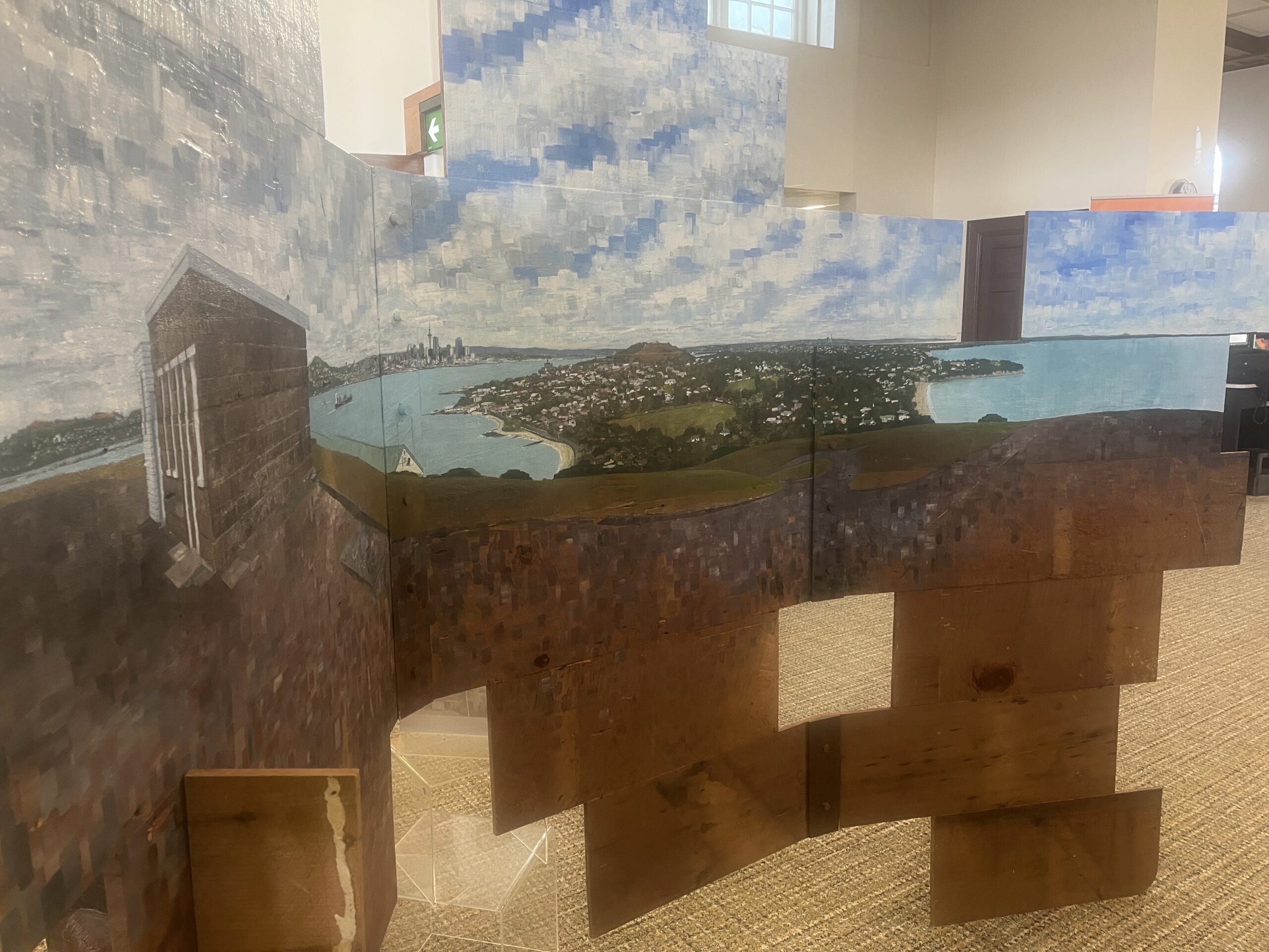 His installation on view in the Remuera Library was constructed on kauri scrim board from a Devonport villa refurbishment. The view is a full-circle view around Maungauika Head and Devonport which includes the land and sea back to Auckland.