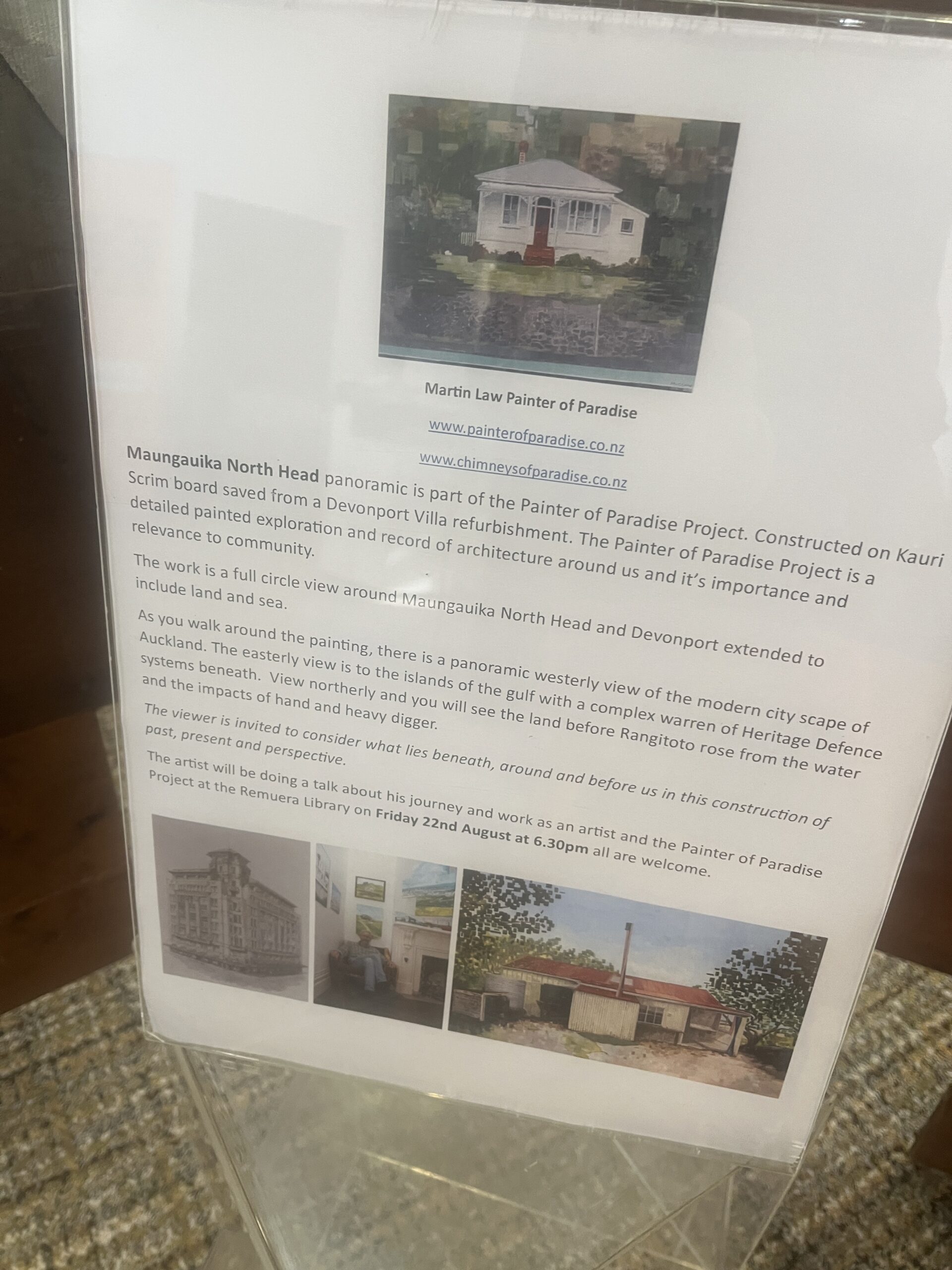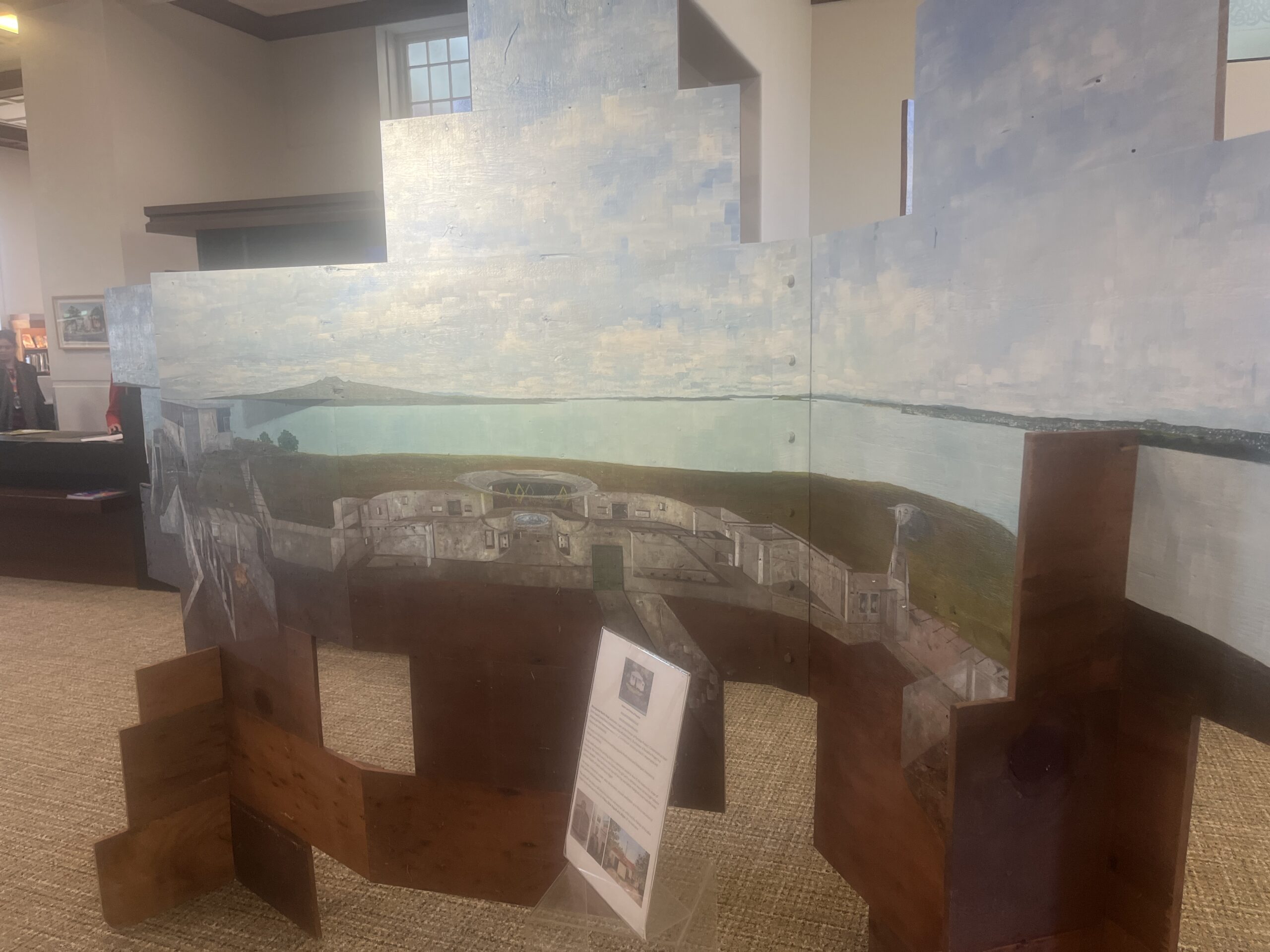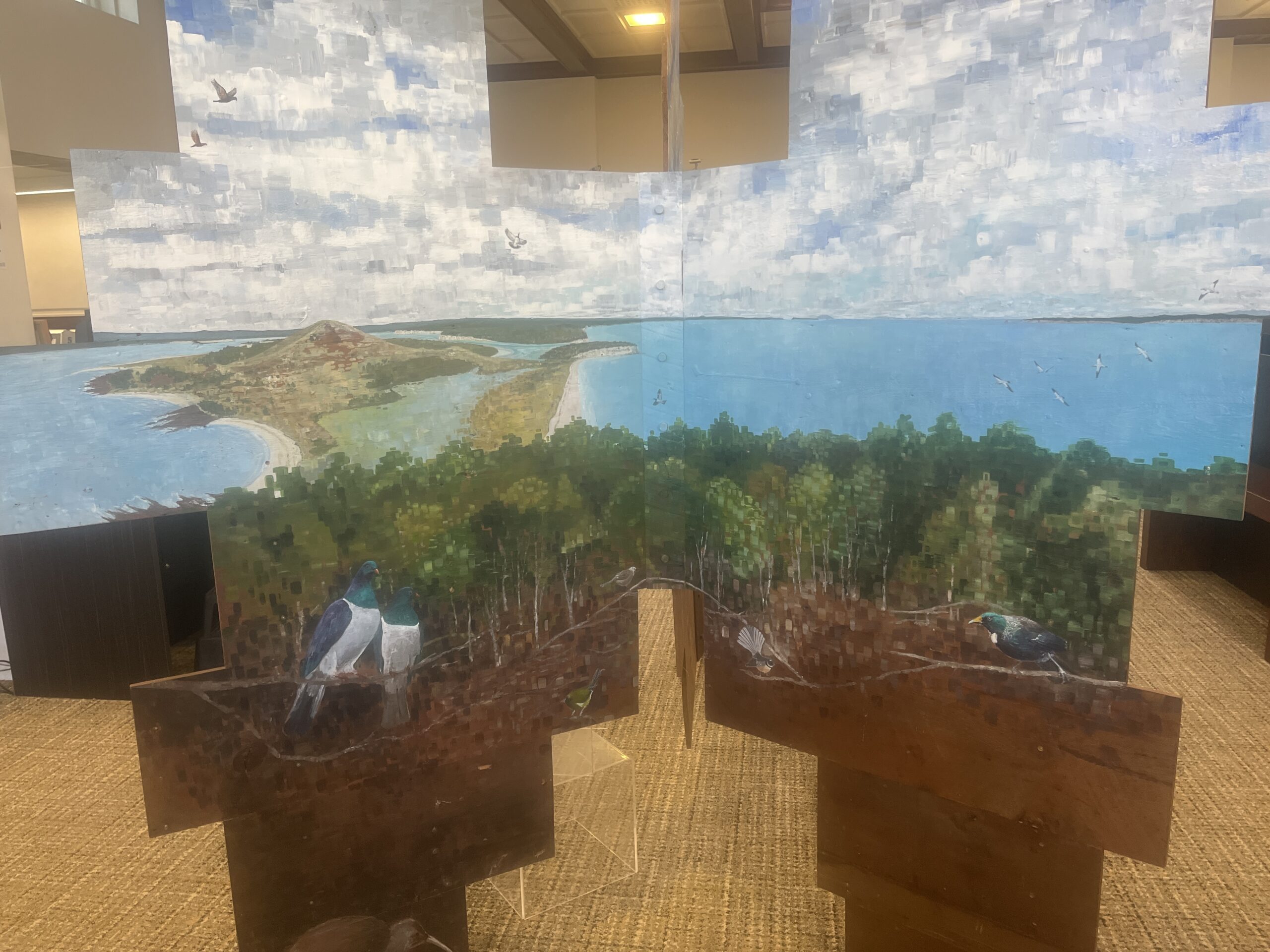 His installation on view in the Remuera Library was constructed on kauri scrim board from a Devonport villa refurbishment. The view is a full-circle view around Maungauika Head and Devonport which includes the land and sea back to Auckland.