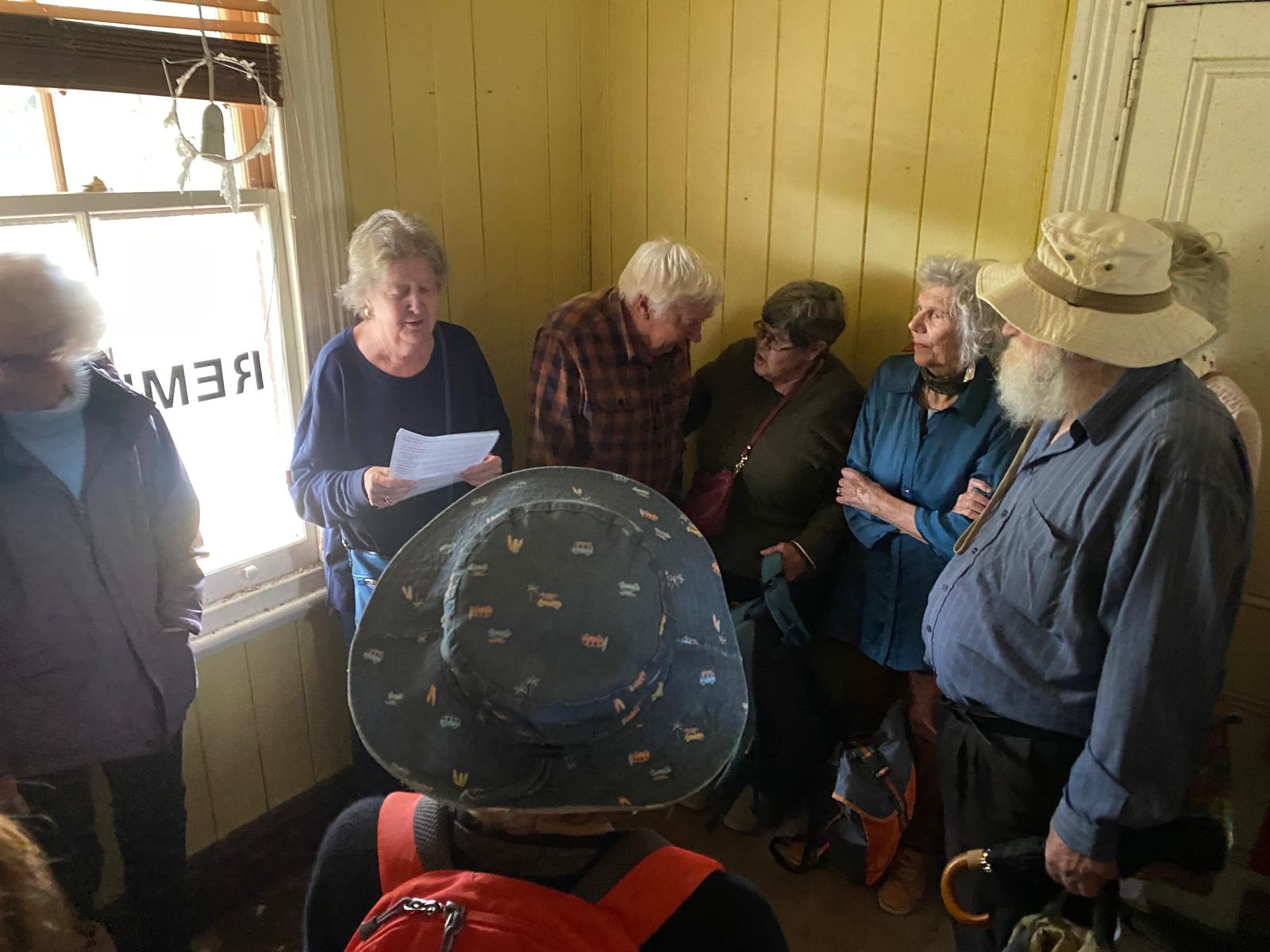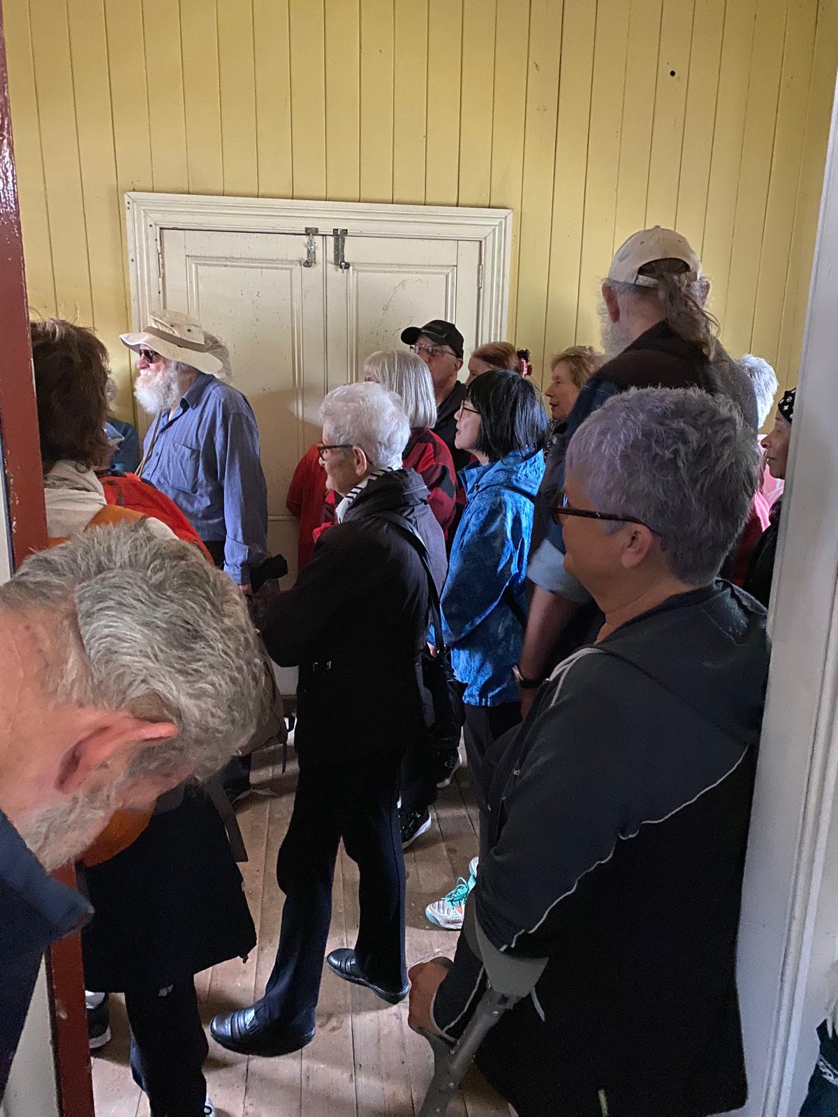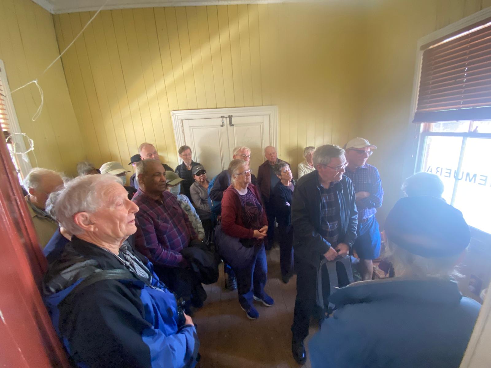 The Society invited its rail enthusiasts to hop on board a train from the Waitemata (Britomart) station to Onehunga, stopping off at Remuera railway station for a 30-minute visit to hear about the history of the station. 60+ people hopped off the train and crammed into the luggage room of the station building to hear from Sue Cooper and Rebecca Washer of Remuera Heritage. Unfortunately, the state of the interior of the station building was very dirty and dangerous. The northern end of the building could not be accessed, and the signal box is under wraps and couldn’t be seen. However, there was considerable interest in this remarkable station, which is one of only two surviving island stations with a signal box in New Zealand. Below is a short history of the Remuera Railway Station.