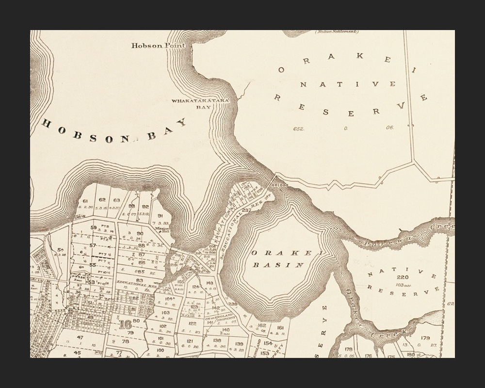 Figure 3: Extract of Sheet 4 of cadastral map of Eden County (Auckland City), 1892, showing the Orakei peninsula (centre) located between Hobson Bay and the Orakei Basin. At this time, the peninsula had been subdivided into lots and set aside as an Educational Reserve (Auckland Libraries Heritage Collections Map 4658).