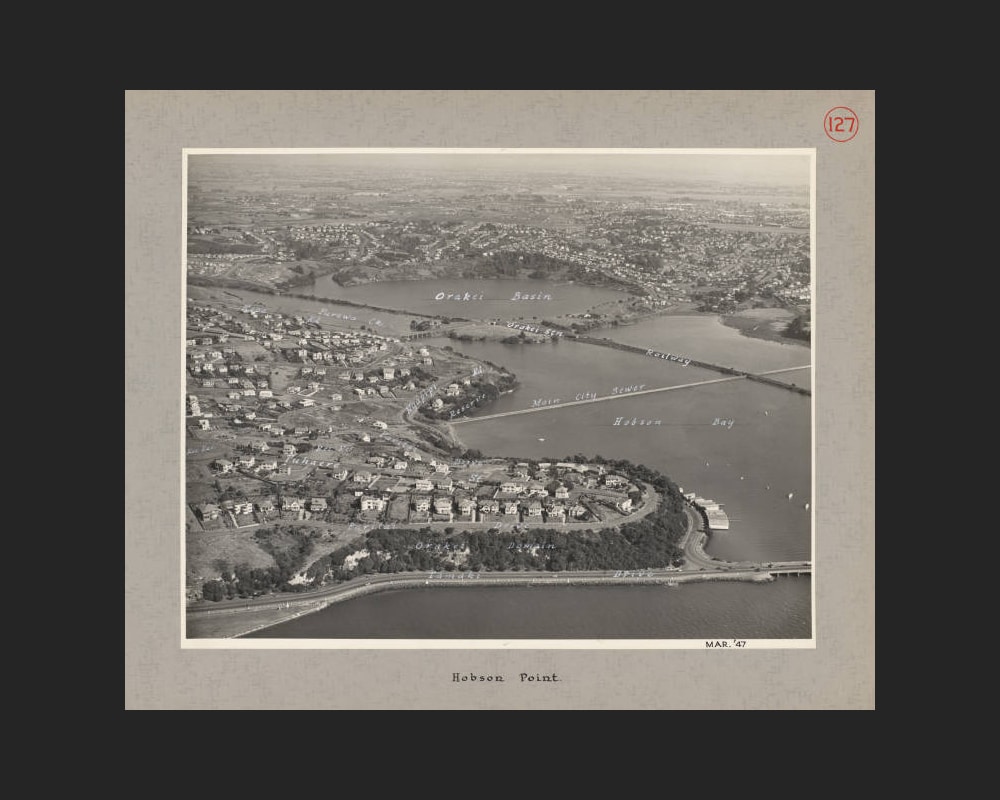 ‘Orakei Bay Village’ at present-day 228 Orakei Road occupies coastal land flanked by the Orakei Basin to the east and Hobson Bay to the west. Forming part of Ngāti Whātua land acquired by the Crown during the mid-nineteenth century, the peninsula is an important Māori pā site known as Ōrākei Pā.[1]