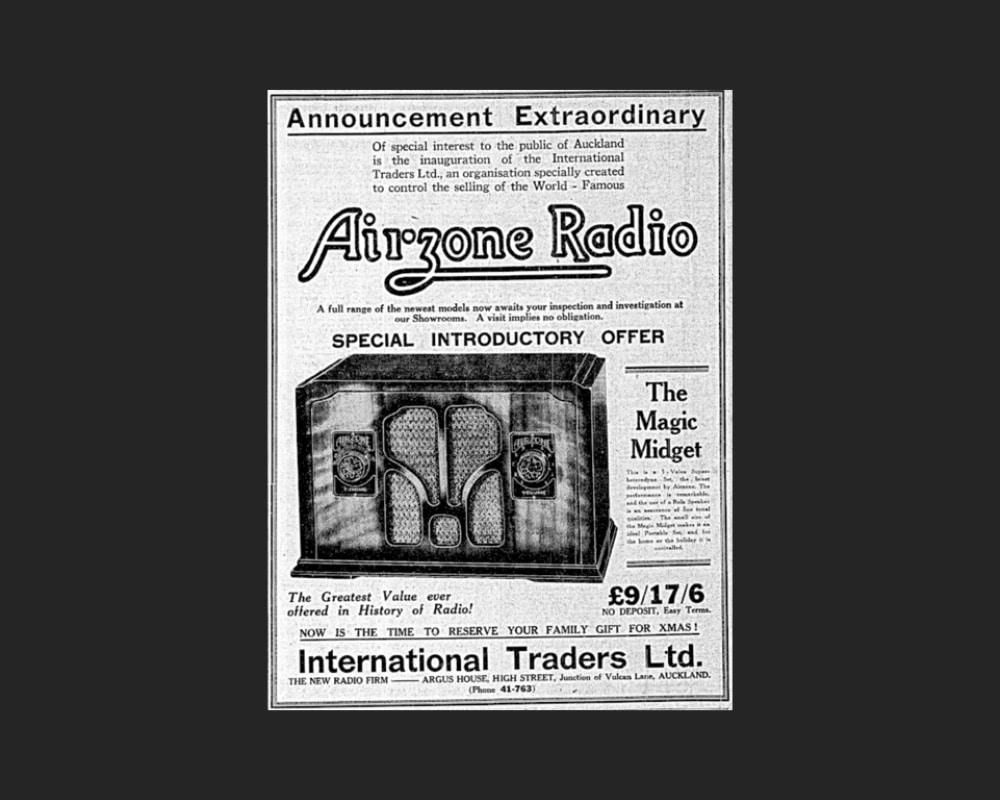 International Traders Limited was established in November 1934 by Ernest Onslow Cox for the purpose of importing and distributing the “world-famous” Airzone radios from Australia (Figure 6).[18] With a showroom on Auckland’s High Street, the company was soon advertising a full range of radios.[19] By 1940, the business was operating out of a factory on nearby Anzac Avenue, manufacturing and/or distributing well-known radio brands such as Bush, EIL, and Motorola.[20]