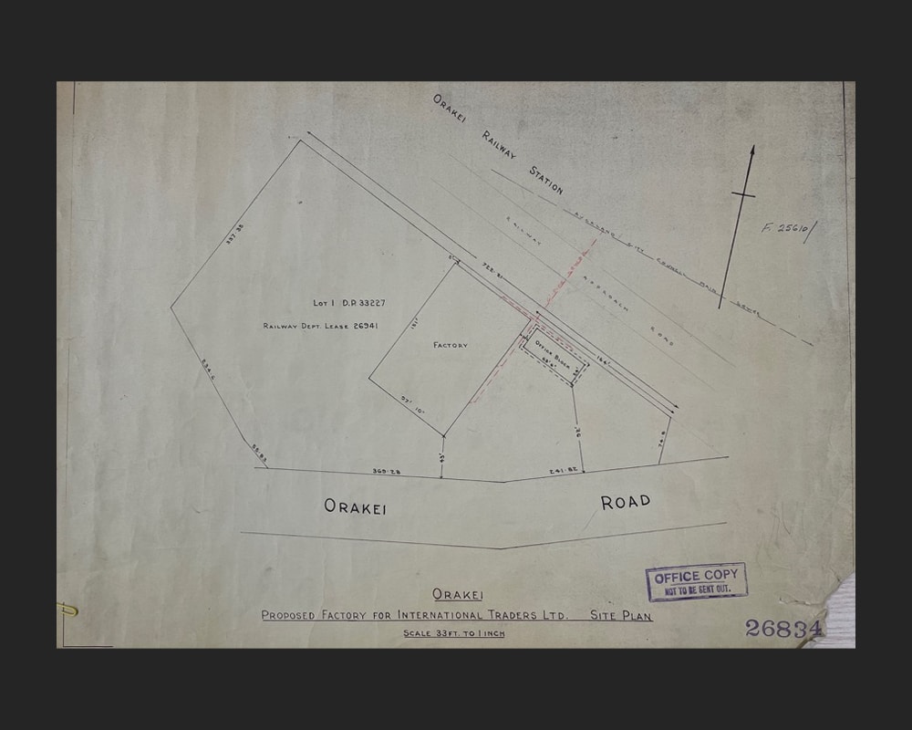 Figure 7: Site plan showing the proposed factory and office block for International Traders Limited, 1953 (Record No. 26834, 1953, Archives New Zealand).