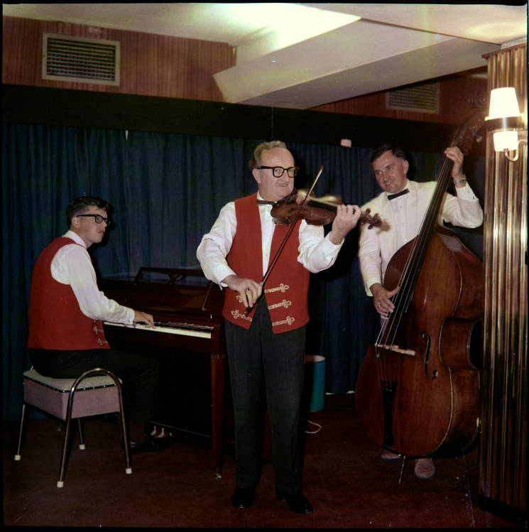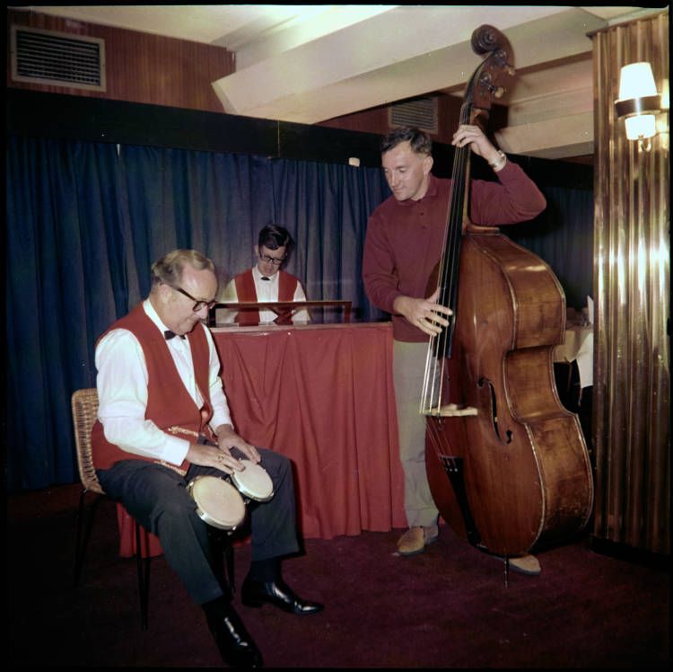 Saturday nights featured a small orchestra, the Paul Lestre Group, and later a gypsy band. Before the war, Lestre had played in the Royal Philharmonic Orchestra, and at one of his first rehearsals, conductor Sir Thomas Beecham noticed him and asked his name. “Paul, sir,” came the response, but Beecham heard it as “Ball” and immediately said, “Very singular.” Lestre – whose birth name was Jim Callan – retired from playing Auckland clubs in 1978, only to return a couple of years later when Stephane Grappelli-style gypsy jazz made a comeback. He was part of the Hot Club de Ponsonby group and played many Cotton Club concerts. The pianist in this photo is Oscar Huijsse Sr., a Dutch émigré who began performing professionally in Auckland just two days after arriving in New Zealand in 1962. He played in most of the city’s leading venues and restaurants and was part of Lestre’s White Heron combo for nearly three years. [4]